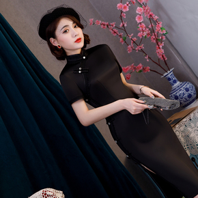 改良新式旗袍年轻款少女2019新款女复古中国风走秀旗袍连衣裙黑色