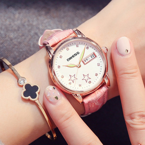 韩版多功能双日历夜光防水女表镶钻五角星皮带休闲学生女士手表潮