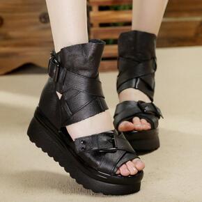 2019春夏季新款真皮防水台厚底松糕坡跟女罗马平底鱼嘴凉鞋学生潮